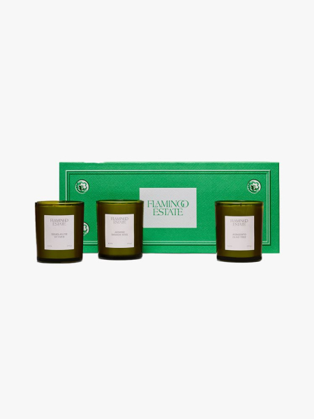 Flamingo Estate Bestsellers Set green box, soap brick, and candle on light gray backgroundSave to wishlistSave to wishlist